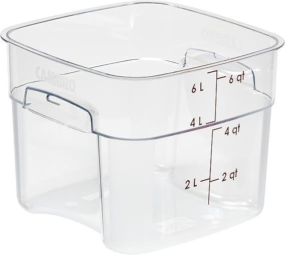Δοχείο αποθήκευσης Cambro CamSquares® FreshPro (5.7 L) από διαφανές Camwear® πολυκαρβονικό, σχεδιασμένο για βαριά επαγγελματική χρήση σε κουζίνες HORECA. Οι εσοχές λαβών και οι στρογγυλεμένες γωνίες εξασφαλίζουν ασφαλές κράτημα και ελεγχόμενο, τετραπλεύρo ράντισμα/χώσιμο, ενώ οι ευδιάκριτες βαθμονομήσεις επιταχύνουν τον έλεγχο αποθεμάτων. Ανθεκτικό σε θερμοκρασίες από −40°C έως 99°C, NSF και πλυντηρίου πιάτων, στοιβάζεται σταθερά για μέγιστη εκμετάλλευση χώρου. Συμβατό με τα Easy Seal Covers FreshPro και προαιρετικές σχάρες στραγγίσματος.