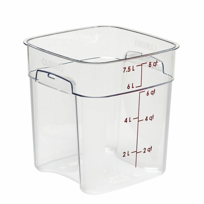 Δοχείο αποθήκευσης Cambro CamSquares® FreshPro (7.6 L) από διαφανές Camwear® πολυκαρβονικό, σχεδιασμένο για βαριά επαγγελματική χρήση σε κουζίνες HORECA. Οι εσοχές λαβών και οι στρογγυλεμένες γωνίες εξασφαλίζουν ασφαλές κράτημα και ελεγχόμενο, τετραπλεύρo ράντισμα/χώσιμο, ενώ οι ευδιάκριτες βαθμονομήσεις επιταχύνουν τον έλεγχο αποθεμάτων. Ανθεκτικό σε θερμοκρασίες από −40°C έως 99°C, NSF και πλυντηρίου πιάτων, στοιβάζεται σταθερά για μέγιστη εκμετάλλευση χώρου. Συμβατό με τα Easy Seal Covers FreshPro και προαιρετικές σχάρες στραγγίσματος.